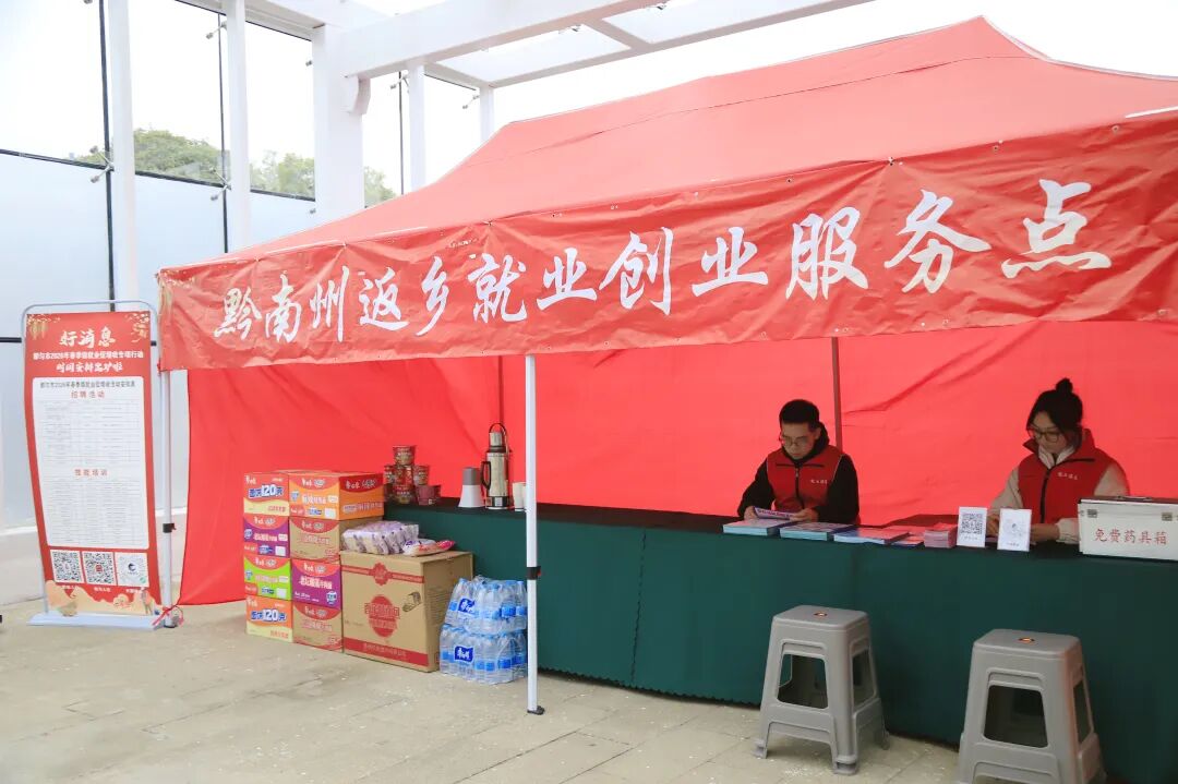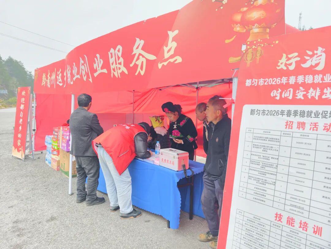 春节即将来临,都匀东站出站口人头攒动,黔南老乡陆续返乡过年。从广西南宁务工回乡的刘江波拖着行李刚出站,目光便被一处亮眼的红色服务帐篷吸引——“黔南州返乡就业创业服务点”,他正读着横幅上的字样,一位工作人员已笑着迎上前来,递过一张《返乡人员信息登记表》:“大哥,一路辛苦了,过来坐坐歇口气,也顺便看看家乡今年的好岗位和培训机会。”
