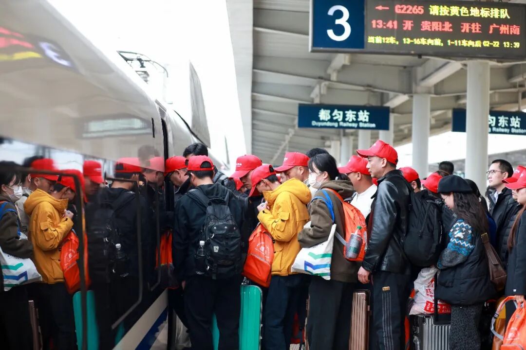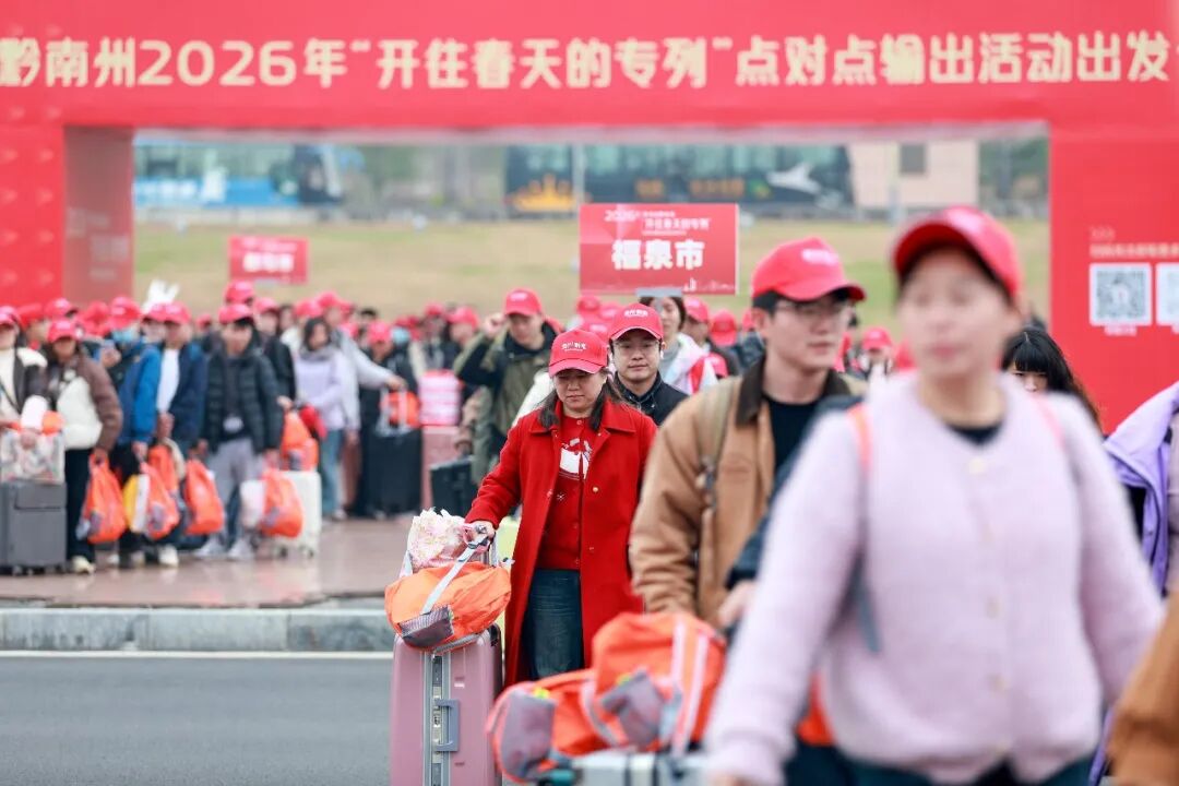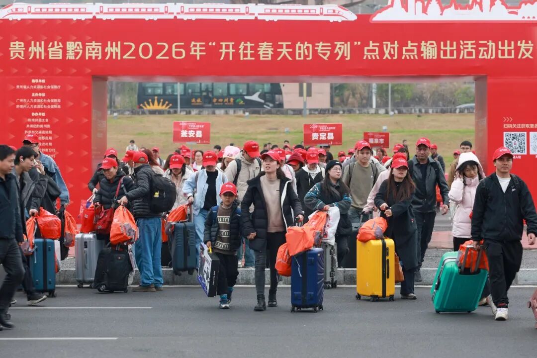 这是今年黔南州开出的首趟免费返岗专列。根据《黔南州稳就业促增收2026年春季专项行动实施方案》,正月初六至正月十六期间,将统筹开行前往广东、浙江方向的免费返岗高铁专列8趟,预计输送外出务工人员4500人以上。各县(市)也将同步组织“点对点”直达专车和集中自驾返岗服务,春节期间计划通过专车专列组织化输出就业1.5万人以上,提供“出家门、上车门、进厂门”的贴心服务。