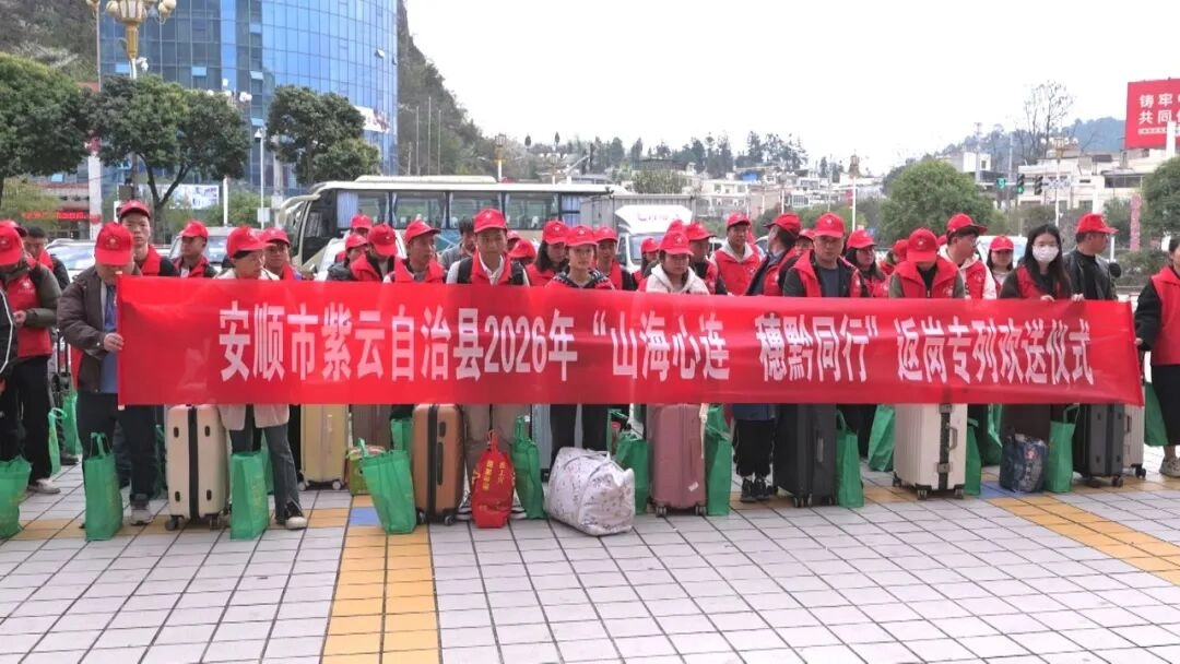 2月26日,安顺市紫云自治县13个乡镇(街道)的70名务工群众齐聚该县客运站,登上该县人社部门统一调配的免费接驳大巴,奔赴贵阳北站换乘“山海心连穗黔同行”返岗务工专列,开启新一年的奋斗征程。