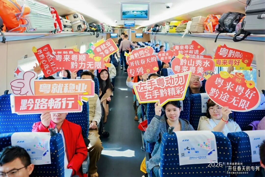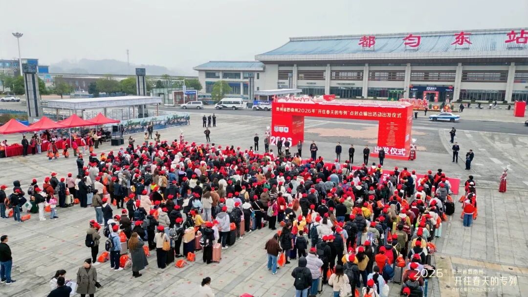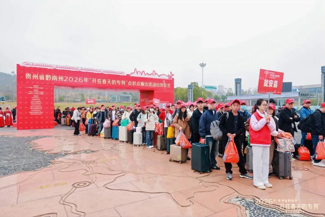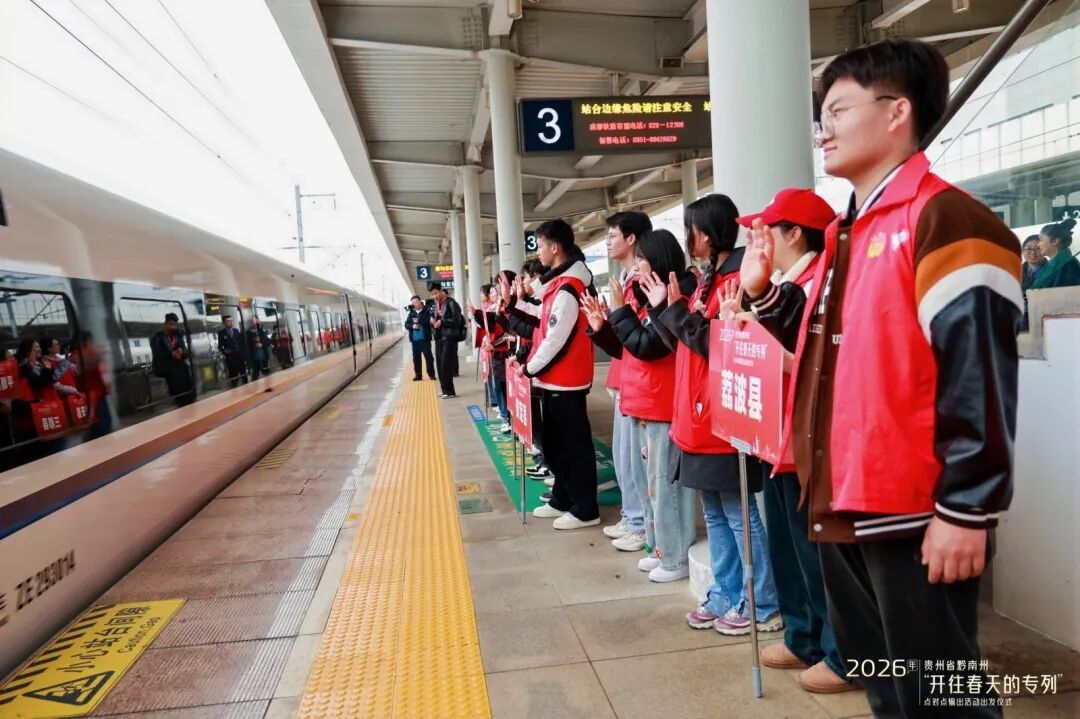 2026年农历正月初六,贵州都匀东站站前广场人潮涌动。在广州务工二十年的罗福英,把腊肉、油辣椒等满满一袋家乡味塞进了行囊——往年因抢票难、转车累不敢多带的“乡愁”,今年借着黔南州开行的“点对点”免费返岗专列,得以安心奔赴远方。13时41分,G2265次列车准时发车,500余名黔南籍务工人员奔赴广州,这已是黔南州连续第七年为外出务工群众开行免费返岗专列。