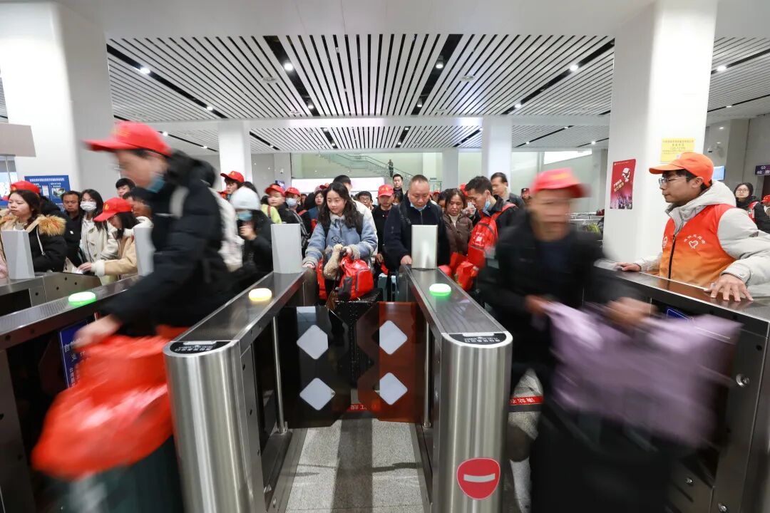 2025年2月5日,来自黔南州各县市的返岗务工人员在都匀东站排队检票进站,准备乘坐返岗务工专列 肖伟 摄