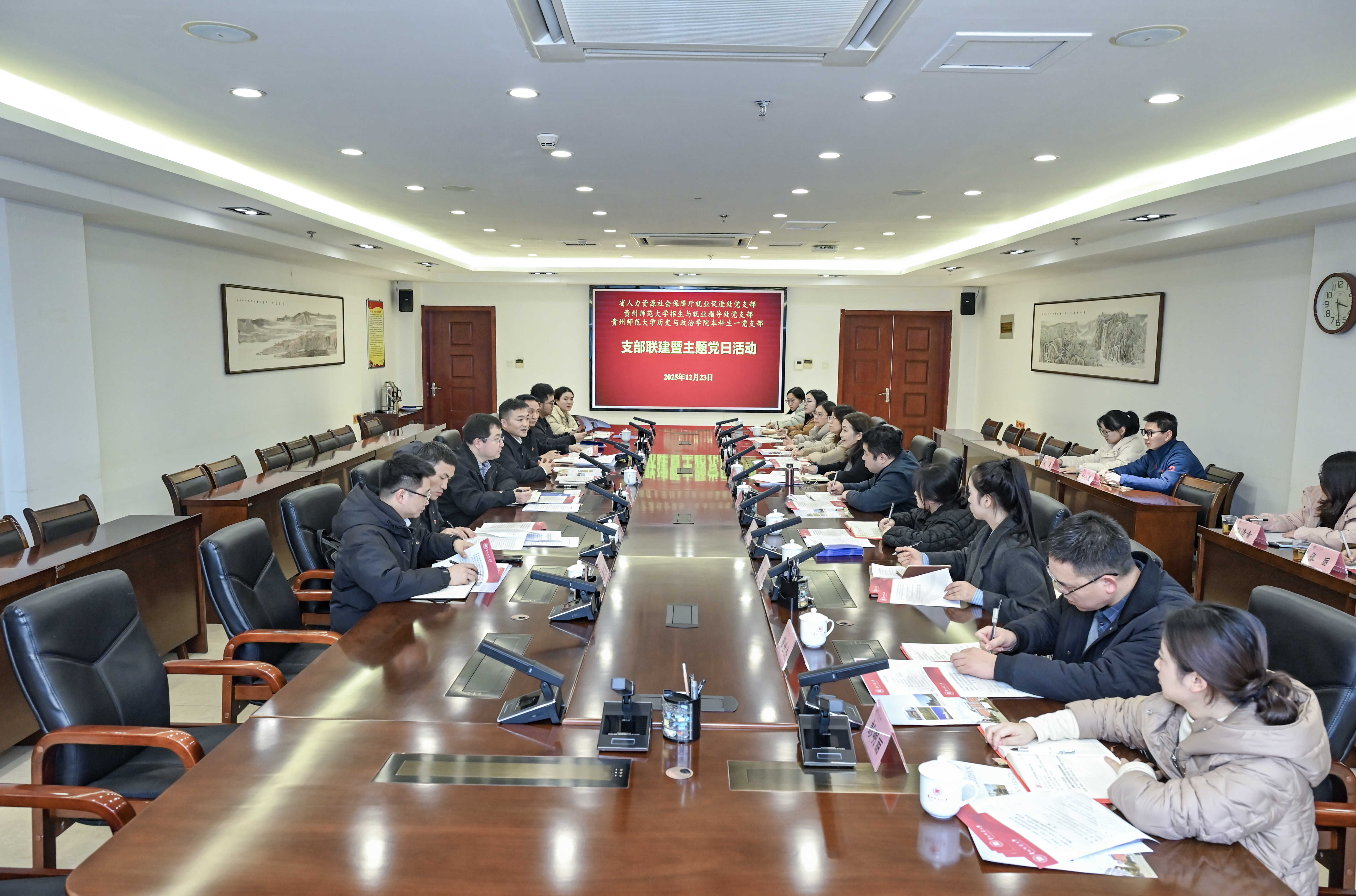 12月23日下午,省人力资源社会保障厅、贵州师范大学在贵州师范大学开展党建联建暨主题党日活动,深入学习贯彻党的二十届四中全会精神和省委十三届八次全会精神,深化政校合作,以党建引领推动高校毕业生高质量充分就业。