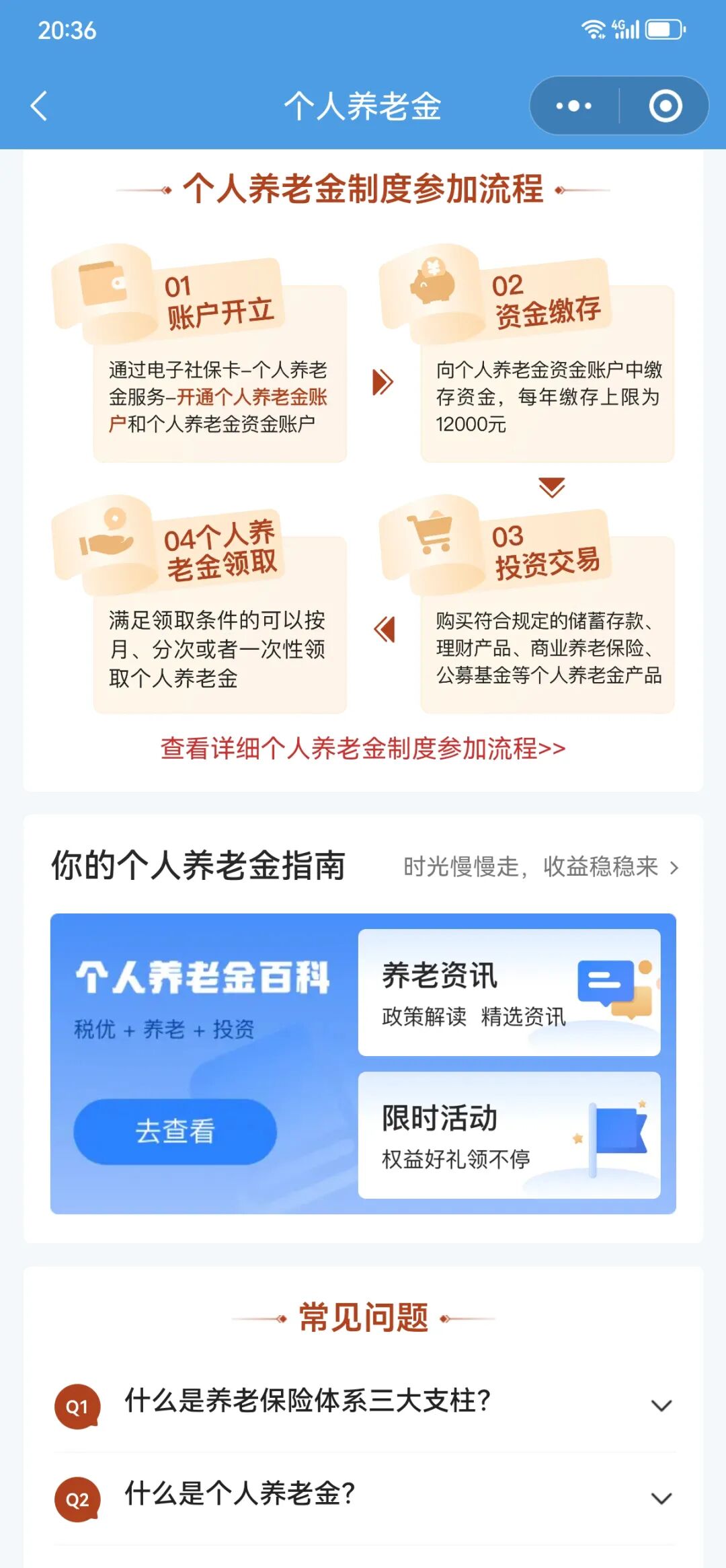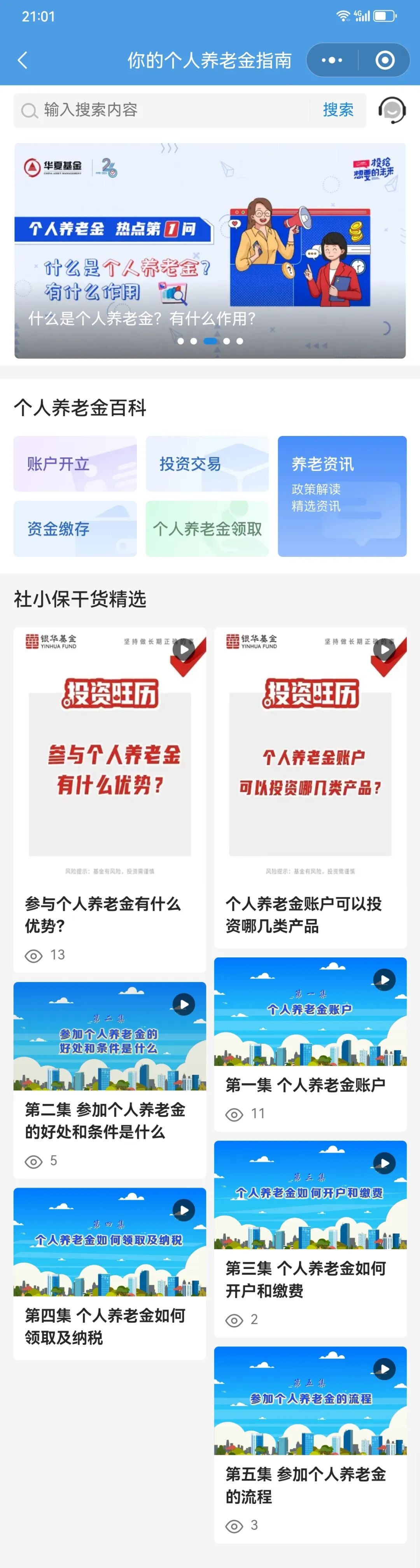 “你的个人养老金指南”专区包含个人养老金百科、养老资讯、限时活动等内容。个人养老金参与金融机构在“你的个人养老金指南”专区内以图文、视频、直播等多种形式,为用户介绍个人养老金有关内容。