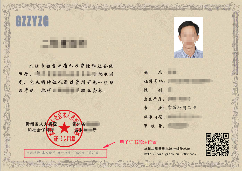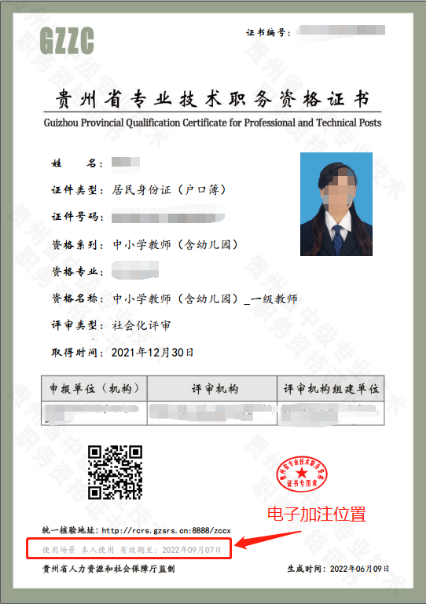 为防止专业技术职称电子证书在非本人授权情形下使用,从2022年6月起在贵州省所发的电子职称证书上加注使用场景和有效期信息,以保护持证人员权益。从持证人申请下载电子职称证书之日起进行电子职称证书加注,有效期限为90天,超过加注有效期后,需重新申请下载。